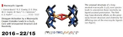 24) Garcia-Bosch, I.; Cowley, R. E.; Díaz, D. E.; Siegler, M. A.; Nam, W.; Solomon, E. I. and Karlin, K.D. “Dioxygen Activation by a Macrocyclic Copper Complex Leads to a Cu2O2 Core with Unexpected Structure and Reactivity”. Chem. Eur. J., 2016, 22, 5133. DOI: 10.1002/chem.201600551